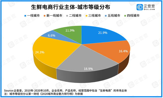 企查查數據顯示,深圳、廣州、徐州是生鮮電商主體分布最多的TOP3城市,意外的是,其中長三角城市并不是很多。從城市等級分布來看,下沉市場(三線、四線、五線城市的加總)生鮮電商主體占比42.8%。