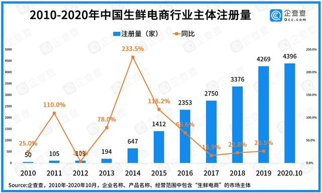 企查查數據顯示,截至2020年10月,我國在業/存續生鮮電商主體1.68萬家,其中個體戶2139家,占比12.7%。從年新增注冊趨勢來看,近十年以來,我國生鮮電商主體的同比增速均為正數,2014年增速達到峰值233.5%,其后增速回落至20%左右。