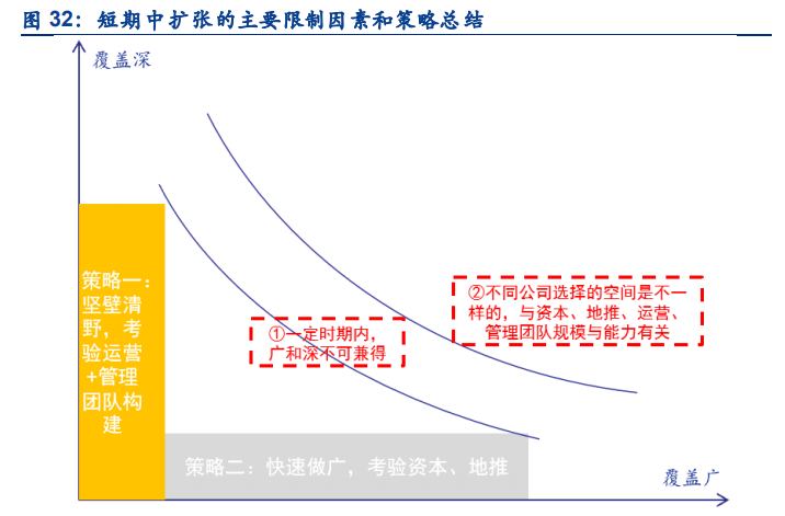 在短期,社區團購拓展依賴資本+地推快速跑馬圈地,運營+管理堅壁清野。一定時期內,覆 蓋廣和深不可兼得,因為團隊規模和新團隊構建速度總是有限的,擴張策略即包括做深和做廣,做廣對資本、地推規模和能力的要求更高,精細運營跟不上易造成虧損,但抓住空白市 場會有先發優勢;做深更依賴運營、管理,更容易在當地立足,但有錯過市場拓展機會的風 險。地推和資本是這階段兩種重要的能力/資源,總部的管理機制和協調能力是隱性的擴張制 約因素。