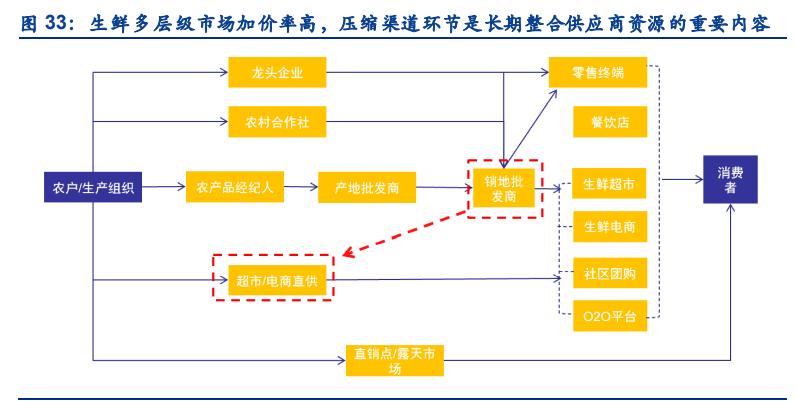 混戰過后,誰能脫穎而出?我們認為建設完整的供應鏈體系是社區團購企業構筑差異化競爭 壁壘的關鍵。長期而言,由于社區團長的平臺忠誠度并不高,由企業投入大量精力與資本的 建立的私域流量池,容易因為團長的離職造成用戶的流失。因此提升供應鏈能力(整合供應 商、構建完整產業鏈),用產品留住顧客才是社區團購贏得長期競爭的壁壘所在。生鮮供應 鏈環節層級較多,各級瓜分利潤以及運輸造成的損耗大,整合中間供應商,縮短供應鏈有助 于優化成本管控,提升利潤空間;建立完整的生鮮產業鏈,掌握優質的產品資源,有助于提 高顧客留存率,最終將價格競爭轉化為產品差異化競爭。