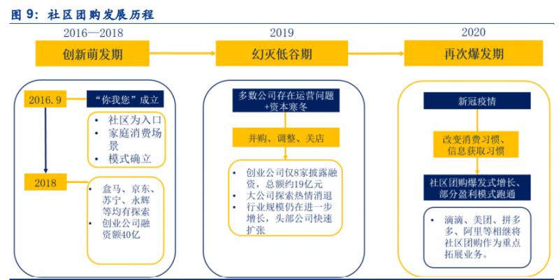從當下主流的社區團購的模式的發展經歷來看,社區團購大體可以分為三個階段:① 2016-2018,模式確立,千團競逐,賽道火熱:2016 年的 9 月,?你我您?成立并以社區為 入口瞄準家庭消費場景,開創了目前社區團購主要的經營模式。盡管?你我您?并非創立最 早的社區團購公司,但這一模式相較于早期的手抄單發布團購消息等方式優勢明顯,模式確 立之后,行業快速爆發,盒馬、京東、蘇寧、永輝等均有探索,創業公司井噴,2018 年,融 資額高達 40 億。②2019 年,風口之后,經營問題顯現疊加資本寒冬,并購、調整、關店成 了社區團購行業的主題,頭部公司仍在快速擴張。2019 年,創業公司中僅 8 家披露了融資, 融資總額約 19 億元,同時大公司探索熱情消退,但行業規模仍在進一步增長。③2020 年, 新冠疫情深刻改變了消費習慣和信息獲取習慣,社區團購迎來爆發式增長,并實現盈利模式 的跑通,滴滴、美團、拼多多、阿里等相繼將社區團購作為重點拓展業務,社區團購開始在 全國范圍內拓展。