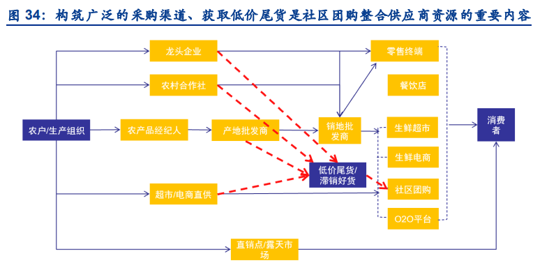 建立供應鏈優勢的核心在于能夠獲得穩定、低價的商品供給以及高效、低成本的流通環節。流通環節層級繁多,使得流通過程損耗大,溢價多,利潤挖掘空間大,我們認為社區團購掌 握商品競爭力、壓縮流通環節成本主要有兩種切入方式:1)生產端直營:自建生產基地, 或者與農戶建立長期穩定的合作,從開端把控產品品質,最大化壓縮流通成本,構建三級供 應鏈短鏈條。但直營模式更適用于土豆、雞蛋等需求和生產均較為穩定的品種,否則消費者 端需求的變化易發生滯銷,自然災害的發生也會造成虧損;2)整合經銷商資源:廣泛合作 經銷商可以轉移生產環節虧損風險,同時發揮規模化采購優勢,壓縮采購成本的同時選品種 類也更為豐富。①高品質產品:與更接近生產端的大型經銷商建立長期合作,平臺可以獲得 穩定的優質產品供給;②低價尾貨:社區團購覆蓋的消費者中包含一部分價格敏感性消費者, 他們對產品品質要求較低,對價格更為敏感。社區團購企業若能深入生鮮產業鏈,與大量中 游經銷商合作,有望利用這部分消費者消化經銷商尾貨庫存。