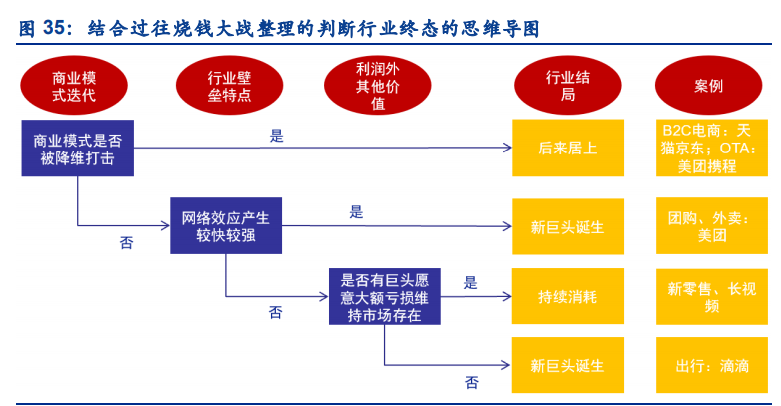 我們以三個會對終態產生重要影響的因素,梳理了互聯網歷史上的 8 次燒錢大戰:①業務本 身是否能夠足夠快的產生網絡效應/規模效應。②業務是否發生了商業模式的迭代,產生了降 維打擊燒錢時代的業務模式。③后續的競爭中,是否有巨頭愿意大額虧損維持市場存在。并梳理了對應通過對應要素判斷行業是否統一的思維導圖。
