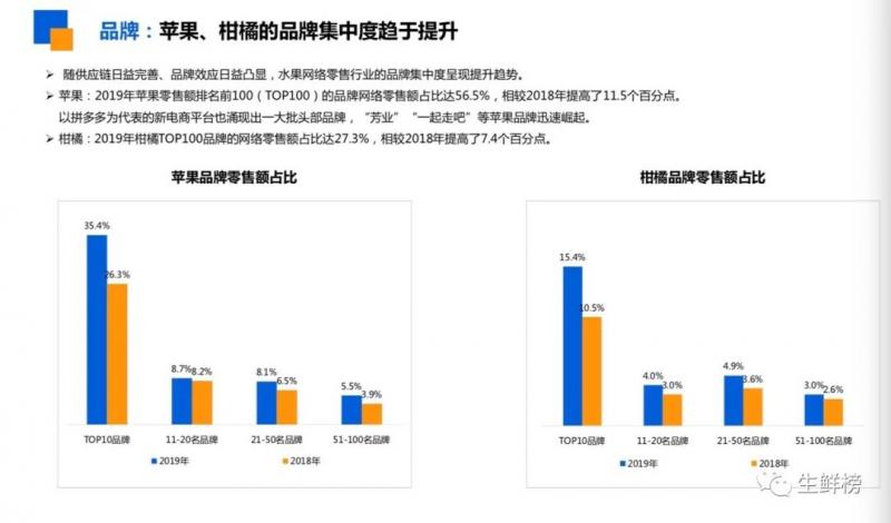 值得一提的是,供應(yīng)鏈日益完善、品牌效應(yīng)日益凸顯,水果網(wǎng)絡(luò)零售行業(yè)的品牌集中度呈現(xiàn)提升趨勢。以蘋果為例2019年蘋果零售額排名前100的品牌網(wǎng)絡(luò)零售額占比達56.5%,相較2018年提高了11.5個百分點。
