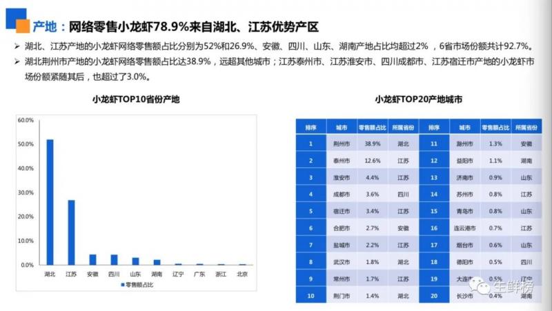 再以小龍蝦為例,2019年全國小龍蝦網(wǎng)絡(luò)零售量2471萬件,同比增長44.5%,是另外一件“超級單品”。4-6月各地成蝦連續(xù)上市,市場供應(yīng)充足,網(wǎng)絡(luò)零售規(guī)模遠超其他月份,3個月共實現(xiàn)全年網(wǎng)絡(luò)零售額的58.9%,網(wǎng)絡(luò)零售量的55.9%。這其中,小龍蝦TOP100品牌的網(wǎng)絡(luò)零售額占比達30.6%,相較2018年提高了0.2個百分點。小龍蝦TOP15品牌的網(wǎng)絡(luò)零售額占比普遍超過了0.3%,“紅功夫”名列榜首,網(wǎng)絡(luò)零售額占比達7.3%。