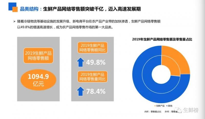 近日,中國農(nóng)業(yè)科學(xué)院農(nóng)業(yè)信息研究所發(fā)布了《中國農(nóng)產(chǎn)品網(wǎng)絡(luò)零售市場暨重點單品分析報告》(2020)》(下稱“報告”),數(shù)據(jù)顯示農(nóng)產(chǎn)品網(wǎng)絡(luò)零售規(guī)模持續(xù)增長,2019年全國農(nóng)產(chǎn)品網(wǎng)絡(luò)零售額4168.6億元,較2018年增長24.8%。而這其中生鮮產(chǎn)品網(wǎng)絡(luò)零售額突破千億,成為農(nóng)產(chǎn)品上行第一大品類,零售額、零售量增長喜人。