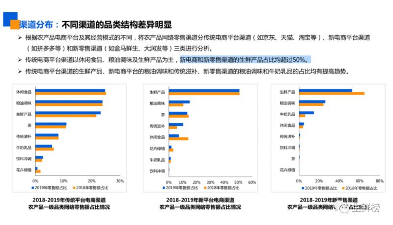 報告顯示,生鮮增量主要來自拼多多、盒馬這類新零售渠道,這類電商中生鮮產(chǎn)品占比均超過50%。而傳統(tǒng)電商平臺渠道則以休閑食品、糧油調(diào)味為主,顯示出較大的品類差異。拼多多平臺柑橘、蘋果、芒果的網(wǎng)絡(luò)零售量占全網(wǎng)同品類的38.6%、44.35%和32.3%,新電商平臺渠道與傳統(tǒng)電商平臺渠道已成抗衡之勢。