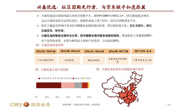 另外,興盛優選的發展模式也非常接地氣,其有三個最大的特點:1)商品結構圍繞家庭廚房場景,生鮮食材占極高比重;2)團長體系由遍布全國的眾多夫妻店、便利店組成;3)瞄準三四線以下城市甚至鄉鎮市場,主打“下沉策略”。