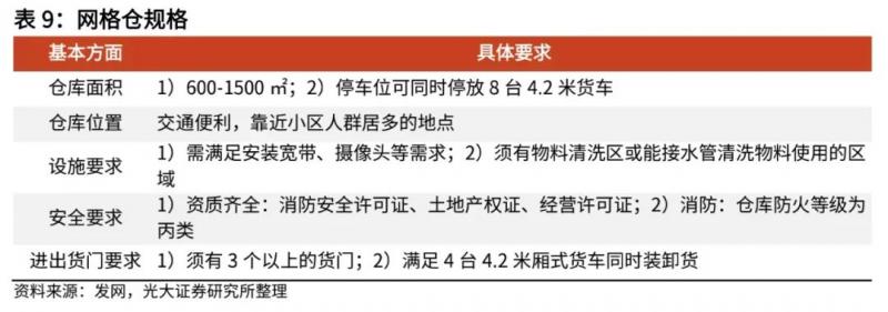網格倉對中心倉送至的貨物進行再次分揀,并送至團長處。網格倉能夠覆蓋周邊15-20KM內300-500個團長,行政區劃角度看,網格倉覆蓋區縣、鄉鎮及村。從網格倉至團長的運輸主要使用微型面包車。