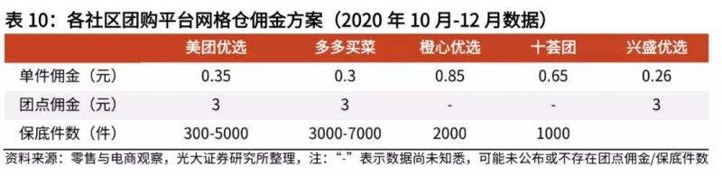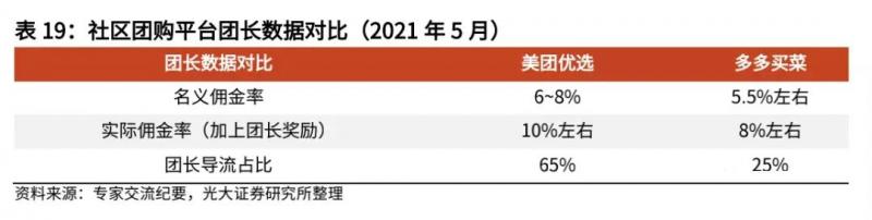 c、客群的引進、運營和售后責任轉移至團長承擔,降低平臺方運營壓力。總體而言,社區團購平臺方壓力被轉移至鏈路其他主體。但需要注意的是,由于全鏈路中外包、加盟環節多,平臺方庫存、運輸、運營壓力雖減少,但人員管理、加盟商關系維系的壓力較大,如何做好全鏈路人員及合作方管理將是社區團購業態的難點。