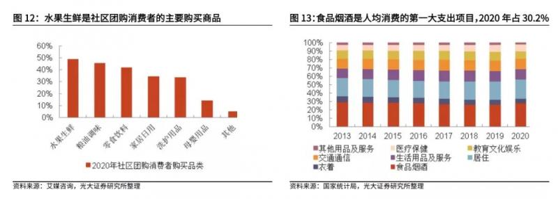 從商品結構看,社區團購現階段主要聚焦家庭廚房,主要包括:a、食品類(以生鮮食材為主);b、日用百貨類。