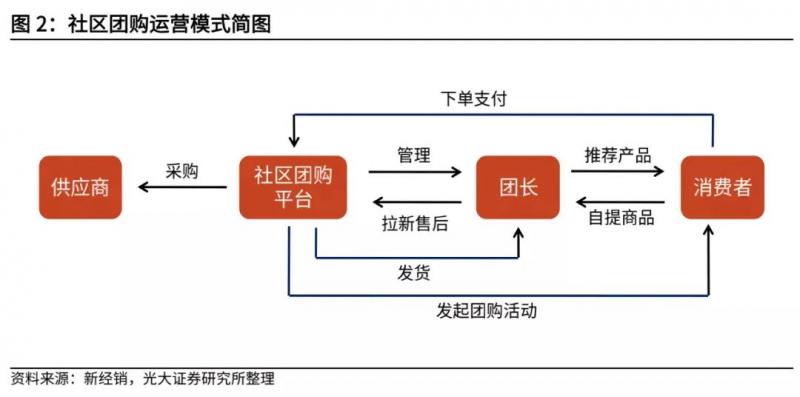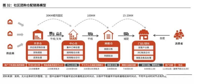 從履約流程看,社區團購主要采用三級倉配,即“共享倉-中心倉-網格倉”,完整的履約鏈路還包含供應商和團長: