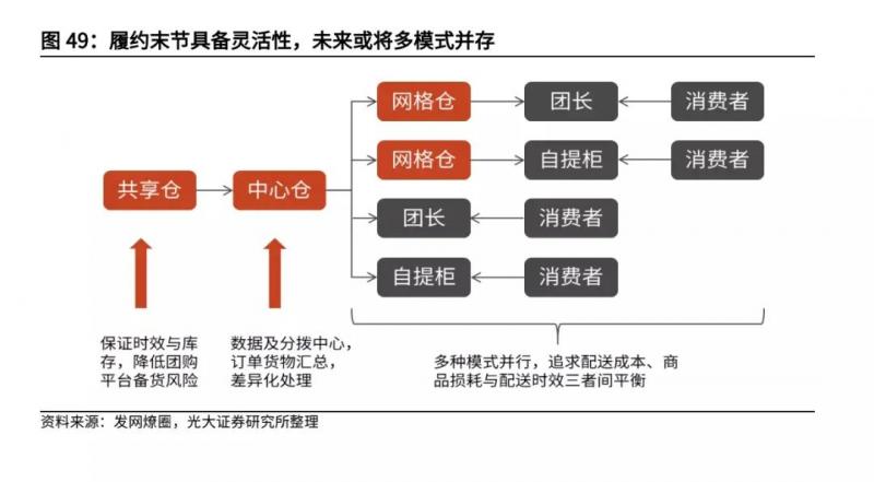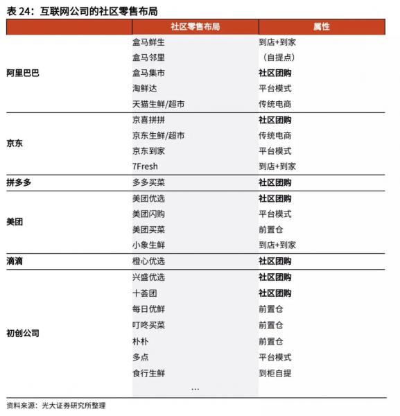 b、社區團購模式采取“提前下單+次日自提”模式,大幅降低履約成本,2018年,出現很多相關創業公司(如十薈團、同程生活等),2019年賽道整合洗牌(呆蘿卜資金鏈斷裂、十薈團合并你我您、同程生活合并考拉精選),2020年受益于疫情,社區團購熱度提升,互聯網巨頭開始相繼布局社區團購。目前,社區零售的商業模式還未定型,現存模式下的同行競爭、自我完善仍將是中短期主題。