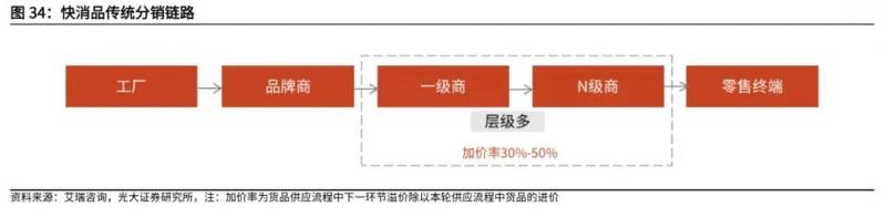 銷地經銷則存在多個層級,一般而言,銷地一級批發市場可輻射周圍3-4個省市,銷地二級批發市場僅覆蓋本省范圍,從省到市縣、鄉鎮間也可能存在更多層級的批發市場和批發商。零售終端經銷商包含當地農貿市場、菜市場、社區便利店、水果店等。多層級的銷地批發商和終端經銷商在商品下沉流通方面起到了毛細血管的作用。傳統鏈路中,生鮮產品總體加價率在100%左右,快消品在經銷商環節總體加價率可達30%-50%。