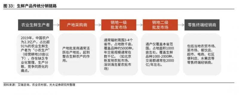 生鮮、快消品傳統分銷鏈路環節眾多。據2019年農業農村部數據,我國有農戶2.3億戶, 其中91%的農戶經營耕地面積在10畝以下。我國農業生鮮生產較為分散,且信息流通效率低、供需信息不對稱等問題仍存在,需要產地采購起整合作用。