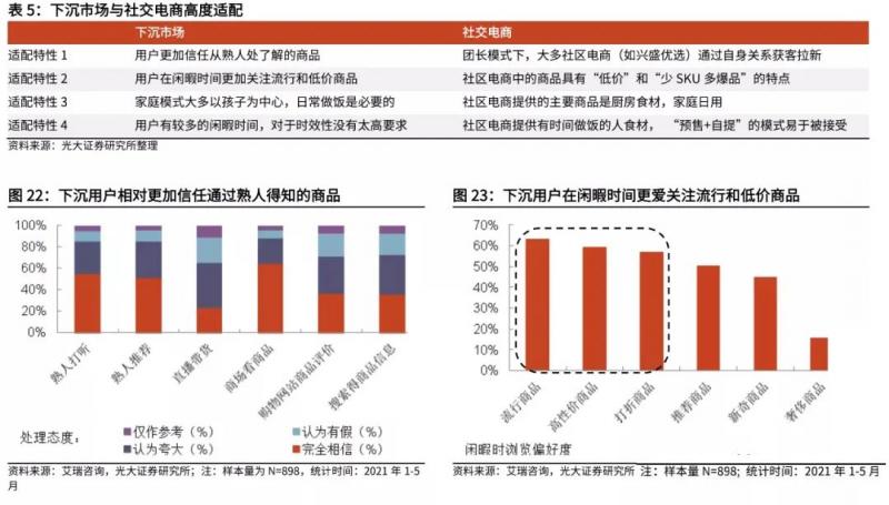 社區團購在下沉市場適配度高,主要體現在以下四點:a、熟人社交購物適配團長模式;b、關注流行/低價商品適配少SKU多爆品的商品結構;c、家庭大多以孩子為中心適配商品以廚房食材為主的特點;d、閑暇時間較多適配“預售+自提”模式。