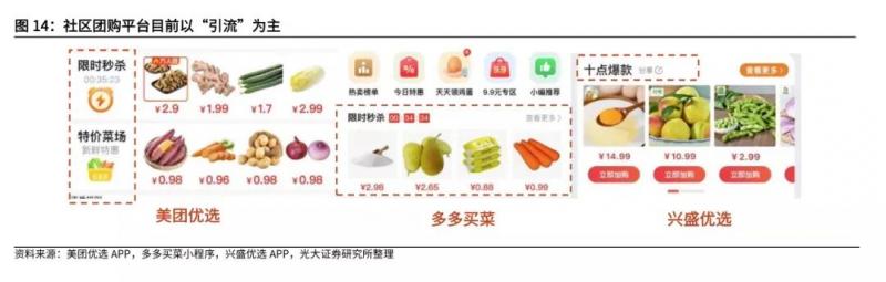 a、產地直采:許多平臺與上游產地政府和農民有著密切合作,比如:拼多多運用 C2M 和“電商扶農”戰略賦能多多買菜;美團優選采用“農鮮直采”計劃。