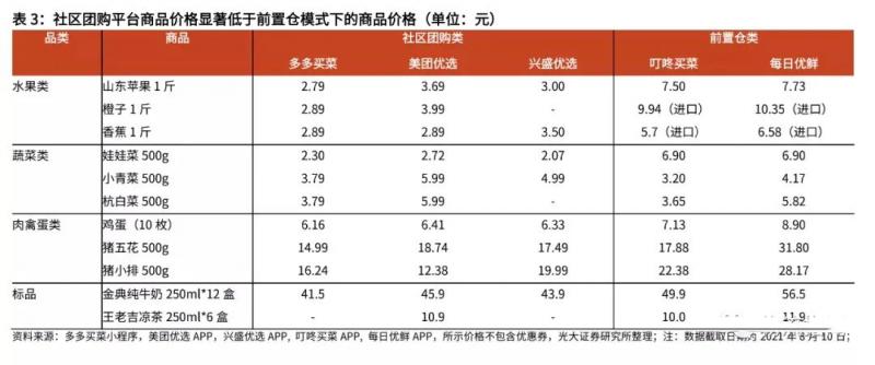 其中:生鮮品類SKU(包括蔬菜、水果、肉禽蛋類和海鮮)占社區團購總 SKU約30%;食品類SKU(包括生鮮品類、糧油、零食、酒飲和速凍食品)占社區團購總SKU約75%;標品類SKU占社區團購總SKU約70%。對于同類型商品,社區團購平臺商品價格顯著低于前置倉模式下的商品價格。