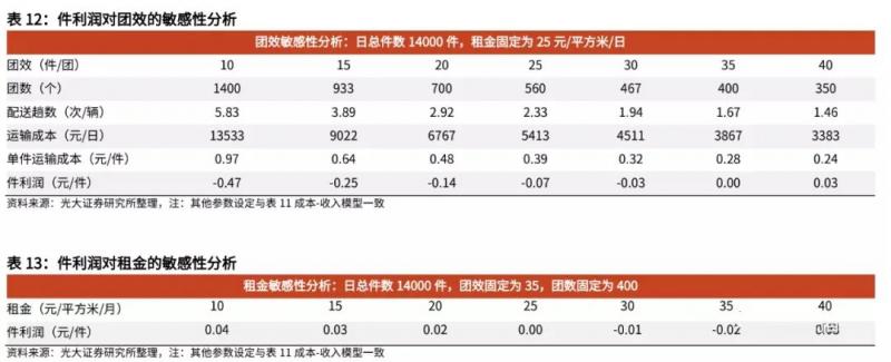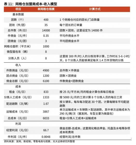 利潤端:不計押金、托盤、水電等雜項,1000平米的單網格倉營業利潤在日均件數14000件,團效35件/團,團點400個的規模下,單日經營利潤66.7元,基本盈虧平衡。