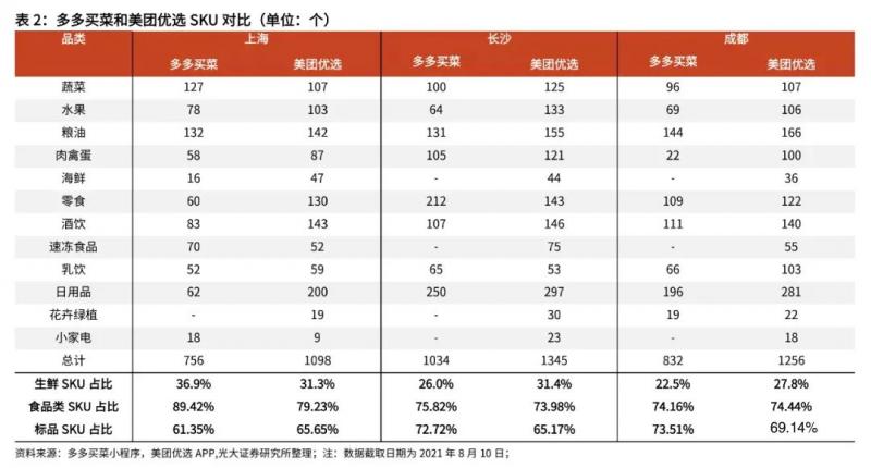 食材類仍是社區團購主要商品。我們統計了多多買菜和美團優選在上海、長沙和成都的SKU分布,截至2021年8月10日,多多買菜的SKU在850個左右,美團優選的SKU在1000個左右。