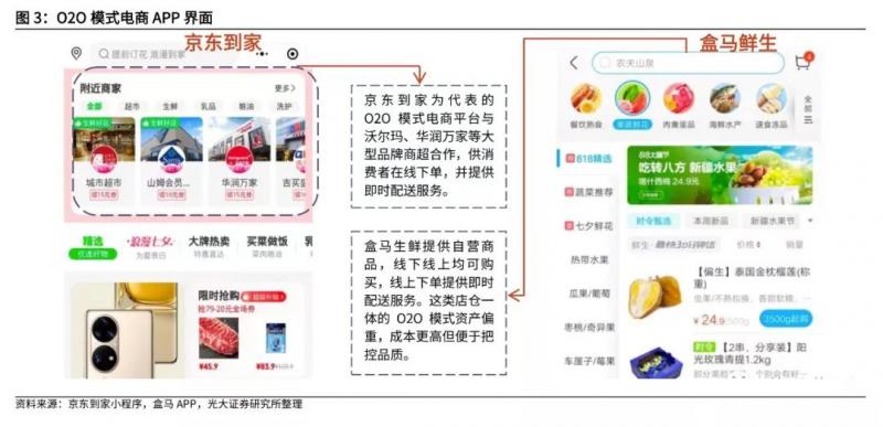 第三階段,2015-2017年:從O2O模式到倉店一體。2015年,眾多新興O2O創業公司上線,如有米、Dmall等,而傳統商超如華潤萬家、沃爾瑪也推出自有O2O平臺,2015年4月京東到家上線。O2O模式下,平臺與線下商超便利店合作,為消費者提供“線上下單+線下配送/自提”服務,平臺方多采用輕資產模式。由于創業公司自身不具備供應鏈優勢,在線下店引入時存在資源不足的問題,2016年,O2O模式開始市場出清,部分商家被淘汰,Dmall 核心高管全部撤離、裁員過半,味道網戰略重心轉向B端。2017年,盒馬鮮生開啟線上業務,主打高品質生鮮,是“超市+餐飲+物流+APP”的復合功能體。相比起2015年較為主流的輕資產O2O模式,盒馬鮮生倉店一體化資產更重,開店成本較大,雖保障了生鮮品質,但成本端承壓。