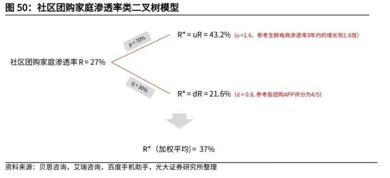 基于目標客群畫像的測算 我們做出前提假設包括:a、社區團購模式下,以家庭為單位進行購買,每戶按照3人測算;b、件單價7.5元,以2021年5月美團優選、多多買菜、橙心優選以及盒馬集市件單價的加權平均值計算。我們定義,社區團購家庭滲透率 = 使用社區團購的家庭/總家庭戶數;社區團購行業規模 = 社區團購家庭滲透率×家庭戶數×每周復購頻次×每單件數×件單價×52周;根據貝恩咨詢,1Q2021的社區團購家庭滲透率為27%。由于社區團購模式較為初期,行業滲透率仍有一定下行風險。參考艾瑞咨詢生鮮電商到2023年的滲透率變化預測和現階段用戶對于社區團購APP的反饋評分,我們通過二叉樹模型得出了參考中值約為37%。