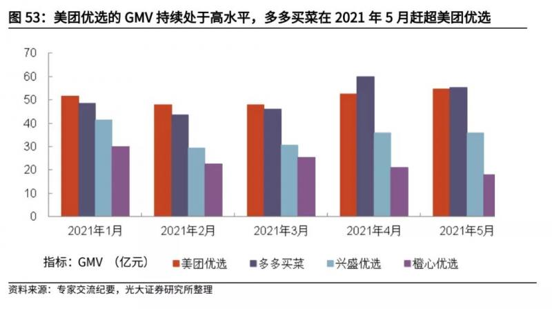 a、從GMV角度看,美團優選的月GMV持續處于高水平,多多買菜月GMV在2021年5月趕超了美團優選。