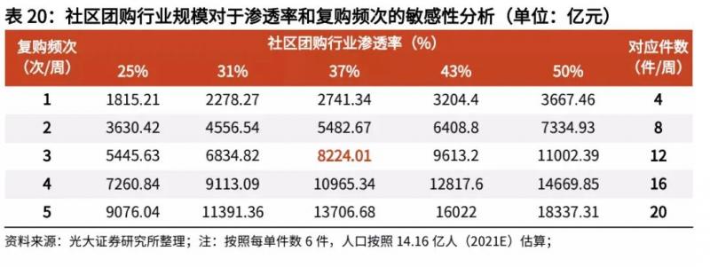 從全國范圍估算,社區團購行業規模2023年可達到8224.01億元。我們假設:社區團購行業滲透率為37%左右,每個家庭每周在社區團購平臺上購買12件商品,以14.16億人(2021E)計算。