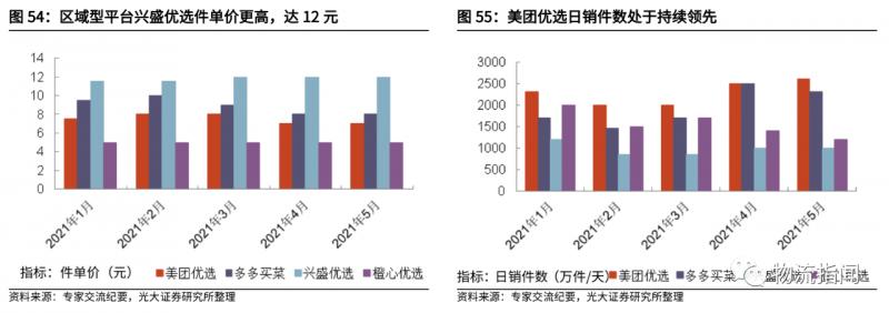 b、件單價最高的平臺為區域型社區團購平臺興盛優選,達12元;美團優選和多多買菜的件單價較低,約為7元。