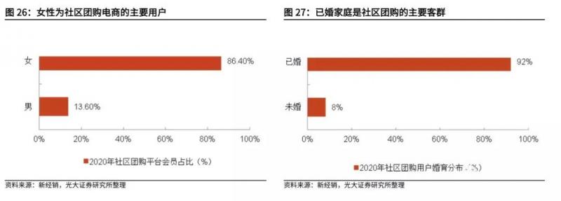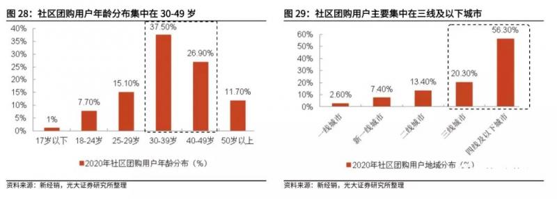 社區團購用戶以下沉城市的已婚女性為主,以家庭為單位進行購買。根據新經銷2020年的統計,女性占社區團購平臺電商的會員的86%;已婚占社區團購用戶的 92%;30-49歲群體占社區團購用戶的64%;下沉城市用戶群體占社區團購用戶的77%,為社區團購的核心用戶。