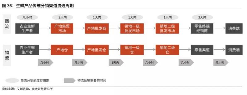 第二,時效改進,庫存周轉壓縮至以小時為單位。生鮮產品的傳統分銷渠道中,各環節都存在一定庫存時間:銷地一級批發市場和二級批發市場均有1天的庫存周期,零售終端經銷商庫存周期為3天內,總計庫存周期至少3天。從配送時間看,生鮮產品從銷地一級倉運輸至銷地二級倉,再運輸至零售渠道直到消費者手中,每一段運輸也均需幾個小時(與距離遠近相關)。