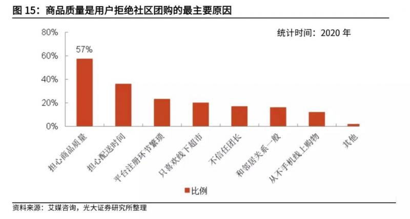 商品品質是提升復購率和用戶留存的關鍵。對于社區團購平臺,提升商品品質一方面有利于培養用戶的粘性,增加復購率的同時拉升客單價;另一方面有利于提升平臺形象,擴大社區團購的目標用戶。根據艾媒咨詢2020年統計,擔心商品品質而拒絕使用社區團購的消費者比例高達57%。