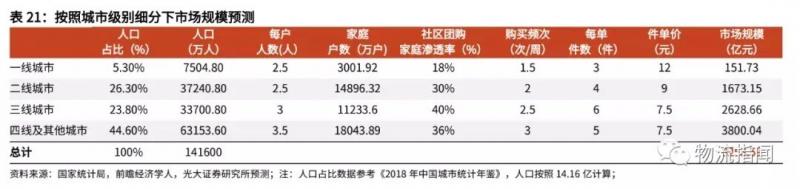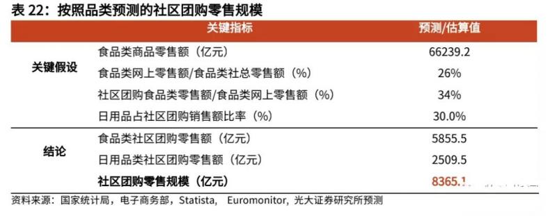 參考麥肯錫2021年中國消費者報告(受訪的線上生鮮食品顧客中,接受“次日送達”模式的顧客約34%),我們以社區團購食品類零售額占食品類網上零售額34%進行估算。