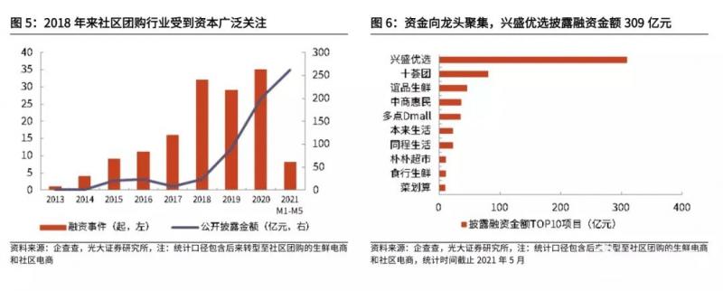 從融資角度看,2018年來社區團購受到資本廣泛關注,資金向龍頭聚集。2019年開始內部洗牌,融資數量略有下降。2020年疫情催化劑下,社區團購再度受到資本關注,相關融資 35 起,融資金額由 2019年的91億元增至200.7億元,同比增加121%。融資金額向頭部聚集,截至2021年5月,興盛優選融資金額居榜首,309億元,遠多于其他參與者。