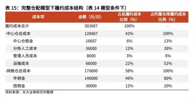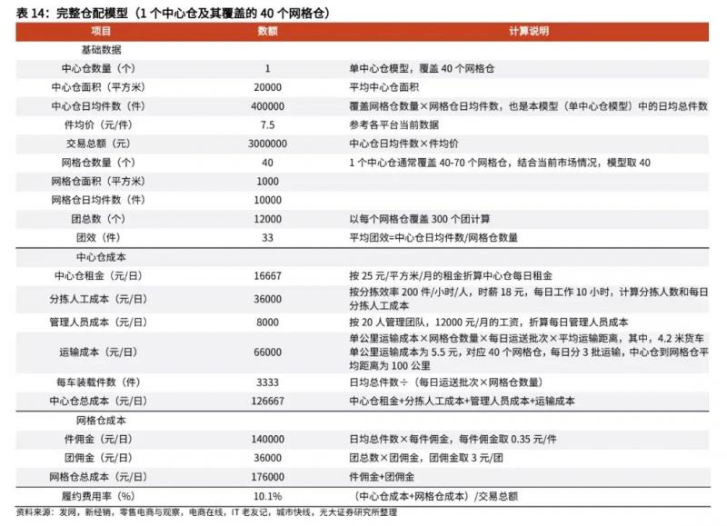 履約成本主要來自網格倉傭金及中心倉運輸成本,履約費用率具備優勢。我們通過模擬一個中心倉及其覆蓋網格倉的運營情況來拆分各倉配環節中的成本構成,參數設置主要參考當前大型社區團購平臺運營情況。