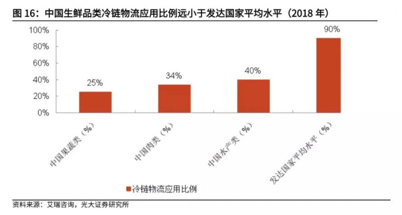 建設冷鏈體系,是社區團購保障生鮮品質的必經之路。中國生鮮品類物流應用比例較低。據艾瑞咨詢,2018年中國果蔬類產品冷鏈物流應用比例25%,肉類34%,水產類40%,遠小于發達國家的冷鏈應用比例90%以上。相關公司也有進一步布局,美團和拼多多對于社區團購業務持續投入,將進一步加強對于冷鏈和物流的建設,防止農產品的變質。