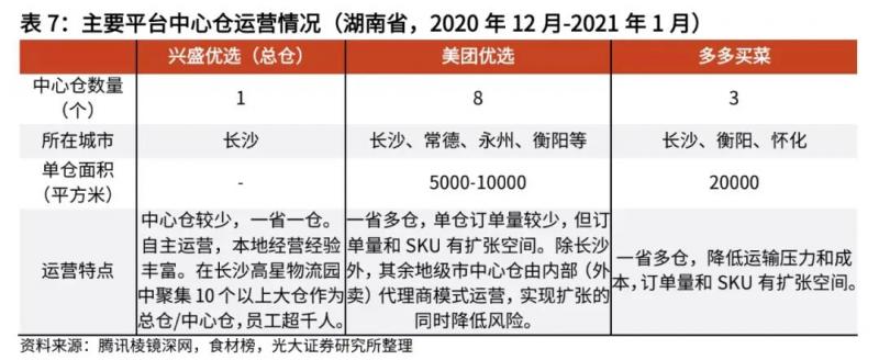 各參與者中心倉運營策略不同,興盛優選少倉深耕,多多美團多倉擴張。興盛優選一省設立一總倉(中心倉),確保訂單集中度、分攤成本。美團優選、拼多多則一省多倉,為未來SKU提升做準備。美團優選將部分中心倉放權給內部(外賣)代理商運營,提高擴張速度的同時降低風險。隨著日均單量增長,各平臺在倉面積擴張。