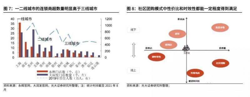 社區團購是傳統商超零售的補充業態,性價比高:1、彌補部分低線城市的線下商超空缺。以江蘇地區的大型商超(永輝和大潤發)為例,一二線城市的連鎖商超數量明顯高于三線城市;在常住人口數接近的情況下,二線城市擁有比三線城市更多的大型全國連鎖商超門店。在三線及以下城市,社區團購可以一定程度上彌補線下商超的空缺。2、作為“電商版連鎖社區便利店模式”,滿足日常的家庭生活需求,對比傳統電商,時效性更強,性價比更高。消費者在傳統電商購買商品,物流時間往往需要2-3天,若加急則需要更高的價格;但是,在社區團購模式下,消費者可以以更低的價格,次日提取。