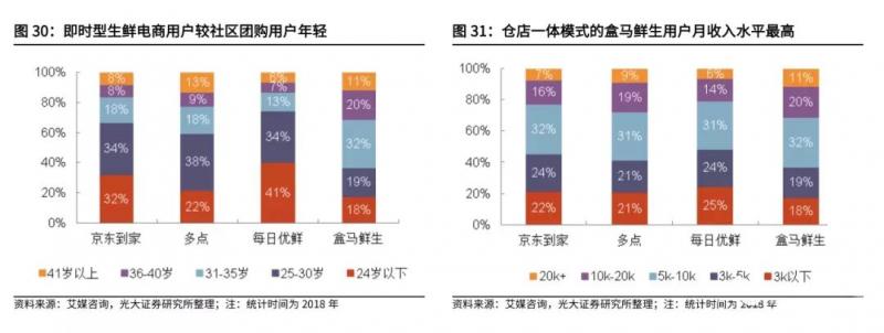 即時類生鮮電商的用戶更加年輕,社區團購彌補40歲以上用戶生鮮線上零售消費需求缺口。根據艾媒咨詢統計,2018年對于京東到家、多點、每日優鮮和盒馬鮮生的統計,即時型電商(包括平臺類和自營類)的用戶較為年輕,41歲以上的用戶僅6%~13%。前置倉模式的每日優鮮的用戶最為年輕,24歲以下的用戶高達41%。對比社區團購,2020年40歲以上的用戶高達38.6%,是對生鮮電商的年齡分布斷層的補充。此外,倉店一體模式的盒馬鮮生的用戶年齡較大,收入水平也較高。