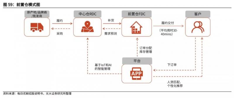 前置倉模式主打配送時效快,以生鮮品類為主。前置倉模式主要參與者有每日優鮮、叮咚買菜、美團買菜等。前置倉一般位于住宅社區或寫字樓附近,為中小型存儲和配送中心,配備多個溫區,可以實現對生鮮的冷藏、冷凍、再加熱。用戶可通過手機APP或小程序下單,平臺將在線訂單分發到最近的前置倉,由配送人員送出,交付時間在30-40分鐘,時效快的同時保障了生鮮產品的新鮮度。