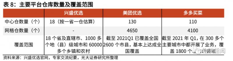 從覆蓋范圍看,1個中心倉可覆蓋40-70個網格倉,1.2-3.5萬個團。為了保障快速將貨物送至中心倉,供應商存儲貨物的共享倉多靠近中心倉,也會出現與中心倉同園區、實質共用一倉的情況。中心倉的覆蓋半徑在100KM左右,主要覆蓋1省或多個城市,網格倉的覆蓋半徑在15-20K,主要覆蓋區、縣、鄉鎮及村。1個中心倉對應周邊40-70個網格倉,一個網格倉可覆蓋300-500個團,即一個中心倉間接覆蓋1.2-3.5萬個團。一般而言每個城市均配有網格倉,滲透率高的城市網格倉數量相對多。