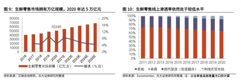 生鮮零售市場規模龐大,線上滲透率依然處于較低水平。根據艾瑞咨詢,生鮮零售市場在 2020年達5萬億元。鑒于生鮮食品易損耗且具有高頻低價的消費屬性,線下模式依然是生鮮零售的主要模式。按2020 年生鮮食品銷售量口徑,傳統農貿市場滲透率為65%,而電商生鮮滲透率僅為7%,在社區團購等新業態催化下,生鮮零售線上滲透率或將進一步提升。