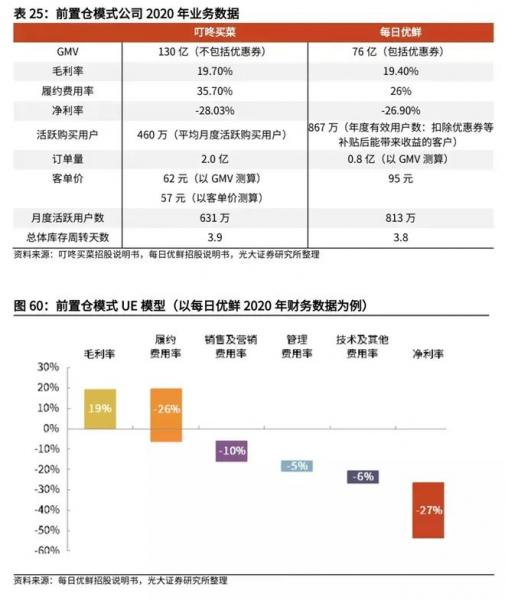 前置倉模式下客單價、履約費用率雙高,模型尚未盈利。前置倉模式生鮮品質較高,時效性好,主要目標客群為高線城市的中高收入客群,客單價較高,2020年叮咚買菜客單價60元左右,每日優鮮95元。前置倉模式下產品履約為騎手上門配送,為了保障時效性騎手單次配送的訂單量有限,因此履約費用率可達25%以上,單均履約成本均在20元以上,高履約成本使UE在中短期時間內難以盈利。