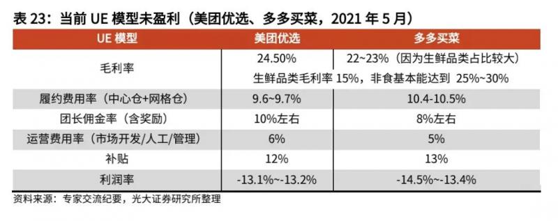 隨著2020年7月美團、拼多多、滴滴等互聯巨頭入場并投入補貼、快速地推,興盛優選UE受到影響,履約費用率升至5%-6%。2021年5月大型平臺如美團優選、多多買菜等,履約費用率在10%左右,加之團長傭金(8%-10%)、補貼(12%-13%)和運營費用(5%-6%),普遍具有10%以上虧損。隨著未來平臺整合、市場滲透率增加,當前各項成本均有壓縮空間,UE模型盈利具備可能性。