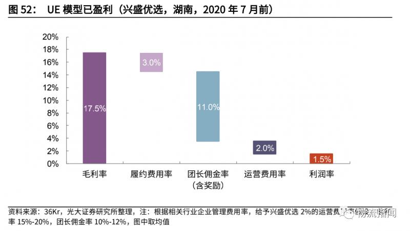 興盛優選區域性UE曾經盈利,新進入巨頭重塑UE模型。據36Kr 數據估計,在2020年7月互聯網巨頭進入社區團購行業前,興盛優選在湖南的履約費用率已降至3%,模型初步盈利。
