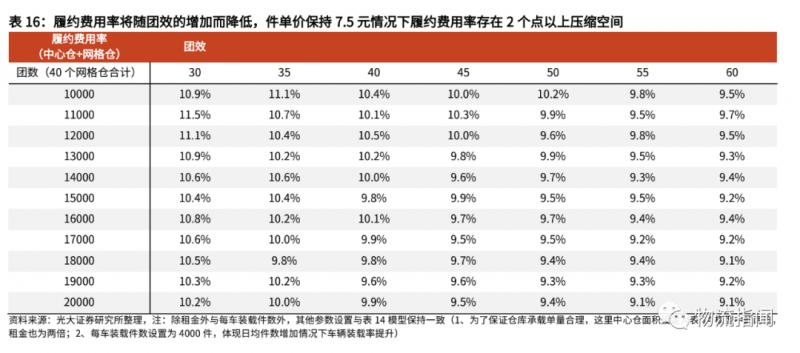 件均價恒定情況下,日均件數增長,履約費用率仍有壓縮空間。除中心倉面積為原來的2倍(防止日均單量增加而爆倉)和每車裝載件數設定為4000件(裝載率隨單量增加而提高)外,其他條件和計算方法與表14模型保持一致。維持7.5元的件單價,團數恒定在11000個時(40×275),團效由30增至60,履約費用率可下降1.8%;團效和團數同時增加時,履約費用率最高可壓縮2個百分點以上。此外,件均價增加、自動化分揀技術的使用等均可促進履約費用率的下降。