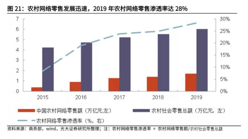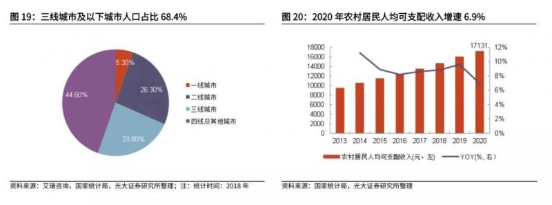 下沉市場人口眾多,可支配收入穩定增長。根據《2018年中國城市建設統計年鑒》,下沉市場泛指三線及以下城鄉地區,下沉城市人口占比 68.4%。下沉市場有近300個地級市,2000+個縣城,40000+個鄉鎮。以農村居民為例,2020年農村居民年人均可支配收入17,131 元,增速6.9%,高于城鎮居民年人均可支配收入增速3.48%。農村網絡零售發展迅速。根據國家商務部2019年統計,2019年農村網絡零售額達1.7萬億元,同期農村社會消費品零售總額6.0萬億元,農村網絡零售滲透率(農村網絡零售額/農村社會消費品零售總額)為28%,較2015年凈增加20pct。
