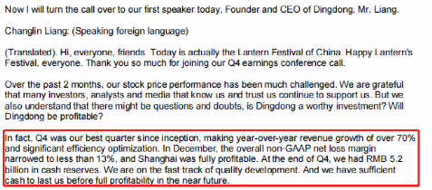 去年12月,整體非GAAP凈虧損幅度收窄至不到13%,上海地區(qū)實(shí)現(xiàn)完全盈利。”并稱(chēng)公司處在質(zhì)量發(fā)展的快車(chē)道上,力爭(zhēng)截至第四季度末Q2末實(shí)現(xiàn)長(zhǎng)三角地區(qū)完全盈利,Q4在全國(guó)接近盈利。