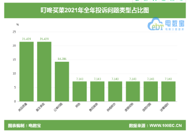 根據(jù)電訴寶網(wǎng)絡(luò)消費(fèi)糾紛調(diào)解平臺(tái)數(shù)據(jù)顯示,叮咚買(mǎi)菜2021年因商品質(zhì)量、霸王條款、訂單問(wèn)題、售后服務(wù)、網(wǎng)絡(luò)欺詐、虛假促銷(xiāo)、退款問(wèn)題、送餐超時(shí)等原因遭到投訴,其中占比最高的便是商品質(zhì)量和霸王條款,再結(jié)合往期處罰信息可見(jiàn)平臺(tái)質(zhì)量問(wèn)題已非常嚴(yán)峻。