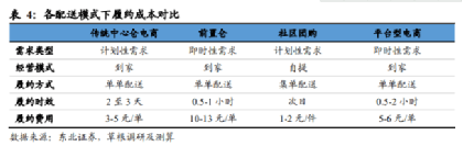 據(jù)東北證券研報(bào)數(shù)據(jù)統(tǒng)計(jì),前置倉(cāng)模式的履約費(fèi)用約為10-13元/單,單位履約成本超出傳統(tǒng)中心倉(cāng)電商7-8元/單、超出社區(qū)團(tuán)購(gòu)9-11元/單、平臺(tái)型電商5-7元/單。
